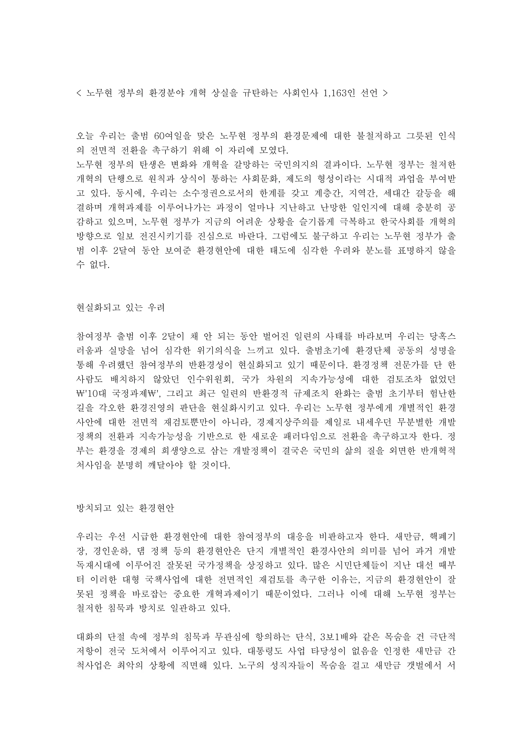 노무현 정부의 환경분야개혁 상실을 규탄하는 사회인사 인 선언< 1,163 >