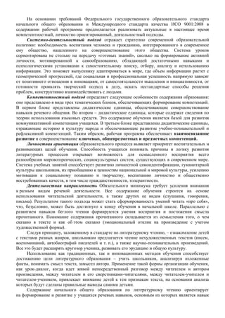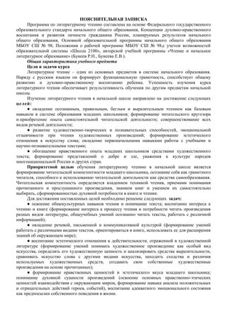 Документ представляет собой пояснительную записку к программе по литературному чтению, разработанной в соответствии с федеральными стандартами и концепцией воспитания детской личности. Программа нацелена на формирование читательской компетентности, развитие речевых навыков и эмоционального восприятия художественной литературы через активное участие учащихся в читательской деятельности. Упор делается на интеграцию различных подходов в обучении, включая деятельностный и компетентностный, с целью подготовки детей к восприятию литературного и культурного богатства.