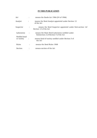 This document defines key terms used in the Seeds Act of 1966 and Seed Rules of 1968 in India, including Act, Analyst, Inspector, Laboratory, Notified kind or variety, and Rules. The Act refers to the Seeds Act of 1966. An Analyst is appointed under Section 12 of the Act to analyze seeds. An Inspector is appointed under Section 13 to inspect seeds. A Laboratory is a State Seed Laboratory notified under the Act. Notified kind or variety refers to those kinds or varieties notified under Section 5. Rules refers to the Seed Rules of 1968.