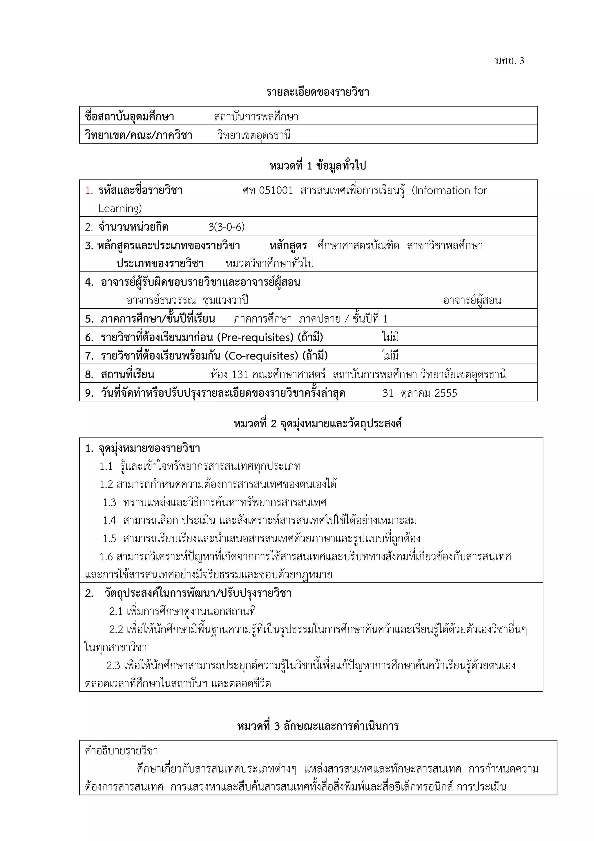 1 ข้อมูลทั่วไป 1. รหัสและชื่อรายวิชา ศท 051001 สารสนเทศเพื่อการเรียนรู้ (Information for Learning) 2. จานวนหน่วยกิต 3(3-0-6) 3. หลักสูตรและประเภทของรายวิชา หลักสูตร ศึกษาศาสตรบัณฑิต สาขาวิชาพลศึกษา ประเภทของรายวิชา หมวดวิชาศึกษาทั่วไป 4. อาจารย์ผู้รับผิดชอบรายวิชาและอาจารย์ผู้สอน อาจารย์ธนวรรณ ชุมแวงวาปี อาจารย์ผู้สอน 5. ภาคการศึกษา/ชั้นปีที่เรียน ภาคการศึกษา ภาคปลาย / ชั้นปีที่ 1 6. รายวิชาที่ต้องเรียนมาก่อน (Pre-requisites) (ถ้ามี) ไม่มี 7. รายวิชาที่ต้องเรียนพร้อมกัน (Co-requisites) (ถ้ามี) ไม่มี 8. สถานที่เรียน ห้อง 131 คณะศึกษาศาสตร์ สถาบันการพลศึกษา วิทยาลัยเขตอุดรธานี 9. วันที่จัดทาหรือปรับปรุงรายละเอียดของรายวิชาครั้งล่าสุด 31 ตุลาคม 2555 หมวดที่ 2 จุดมุ่งหมายและวัตถุประสงค์ 1. จุดมุ่งหมายของรายวิชา 1.1 รู้และเข้าใจทรัพยากรสารสนเทศทุกประเภท 1.2 สามารถกาหนดความต้องการสารสนเทศของตนเองได้ 1.3 ทราบแหล่งและวิธีการค้นหาทรัพยากรสารสนเทศ 1.4 สามารถเลือก ประเมิน และสังเคราะห์สารสนเทศไปใช้ได้อย่างเหมาะสม 1.5 สามารถเรียบเรียงและนาเสนอสารสนเทศด้วยภาษาและรูปแบบที่ถูกต้อง 1.6 สามารถวิเคราะห์ปัญหาที่เกิดจากการใช้สารสนเทศและบริบททางสังคมที่เกี่ยวข้องกับสารสนเทศ และการใช้สารสนเทศอย่างมีจริยธรรมและชอบด้วยกฎหมาย 2. วัตถุประสงค์ในการพัฒนา/ปรับปรุงรายวิชา 2.1 เพิ่มการศึกษาดูงานนอกสถานที่ 2.2 เพื่อให้นักศึกษามีพื้นฐานความรู้ที่เป็นรูปธรรมในการศึกษาค้นคว้าและเรียนรู้ได้ด้วยตัวเองวิชาอื่นๆ ในทุกสาขาวิชา 2.3 เพื่อให้นักศึกษาสามารถประยุกต์ความรู้ในวิชานี้เพื่อแก้ปัญหาการศึกษาค้นคว้าเรียนรู้ด้วยตนเอง ตลอดเวลาที่ศึกษาในสถาบันฯ และตลอดชีวิต หมวดที่ 3 ลักษณะและการดาเนินการ คาอธิบายรายวิชา ศึกษาเกี่ยวกับสารสนเทศประเภทต่างๆ แหล่งสารสนเทศและทักษะสารสนเทศ การกาหนดความ ต้องการสารสนเทศ การแสวงหาและสืบค้นสารสนเทศทั้งสื่อสิ่งพิมพ์และสื่ออิเล็กทรอนิกส์ การประเมิน มคอ. 3