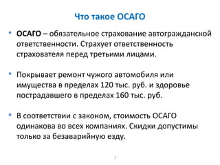 Документ описывает особенности обязательного страхования автогражданской ответственности (ОСАГО) в России, включая его цену, срок действия и механизм получения скидок за безаварийное вождение. ОСАГО покрывает ущерб, причинённый третьим лицам, и оформляется на срок не менее трёх месяцев через портал 'Российской системы автострахования'. Также приведены инструкции для клиентов при ДТП и при расторжении договора.