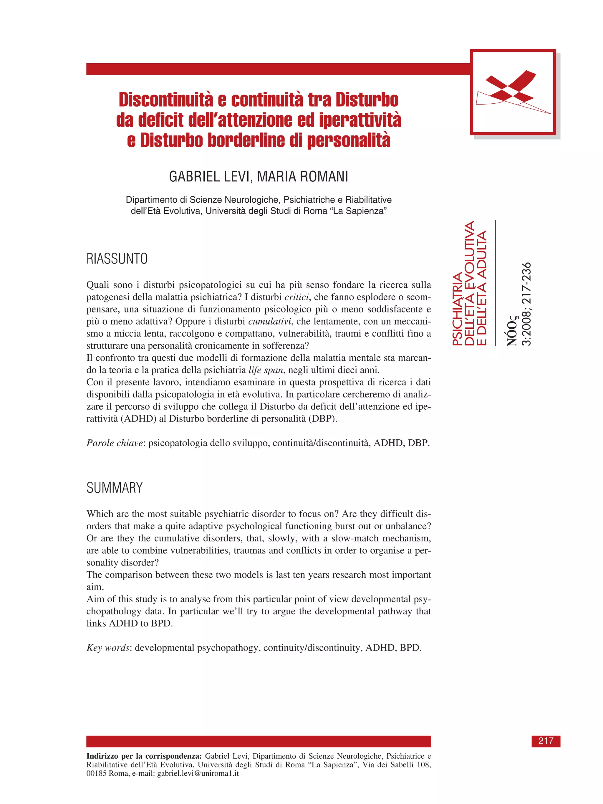 Il documento analizza la continuità e discontinuità tra il Disturbo da Deficit di Attenzione e Iperattività (ADHD) e il Disturbo Borderline di Personalità (DBP), proponendo un confronto tra disturbi critici e cumulativi nella patogenesi della malattia psichiatrica. Si discute l'importanza dei tratti di personalità nello sviluppo psicologico e di come la psicopatologia evolutiva possa fornire una comprensione approfondita dei fattori protettivi e di rischio. Inoltre, il documento esplora la complessità e l'eterogeneità dei disturbi di personalità, evidenziando la necessità di approcci diagnostici più selettivi e basati sullo sviluppo.