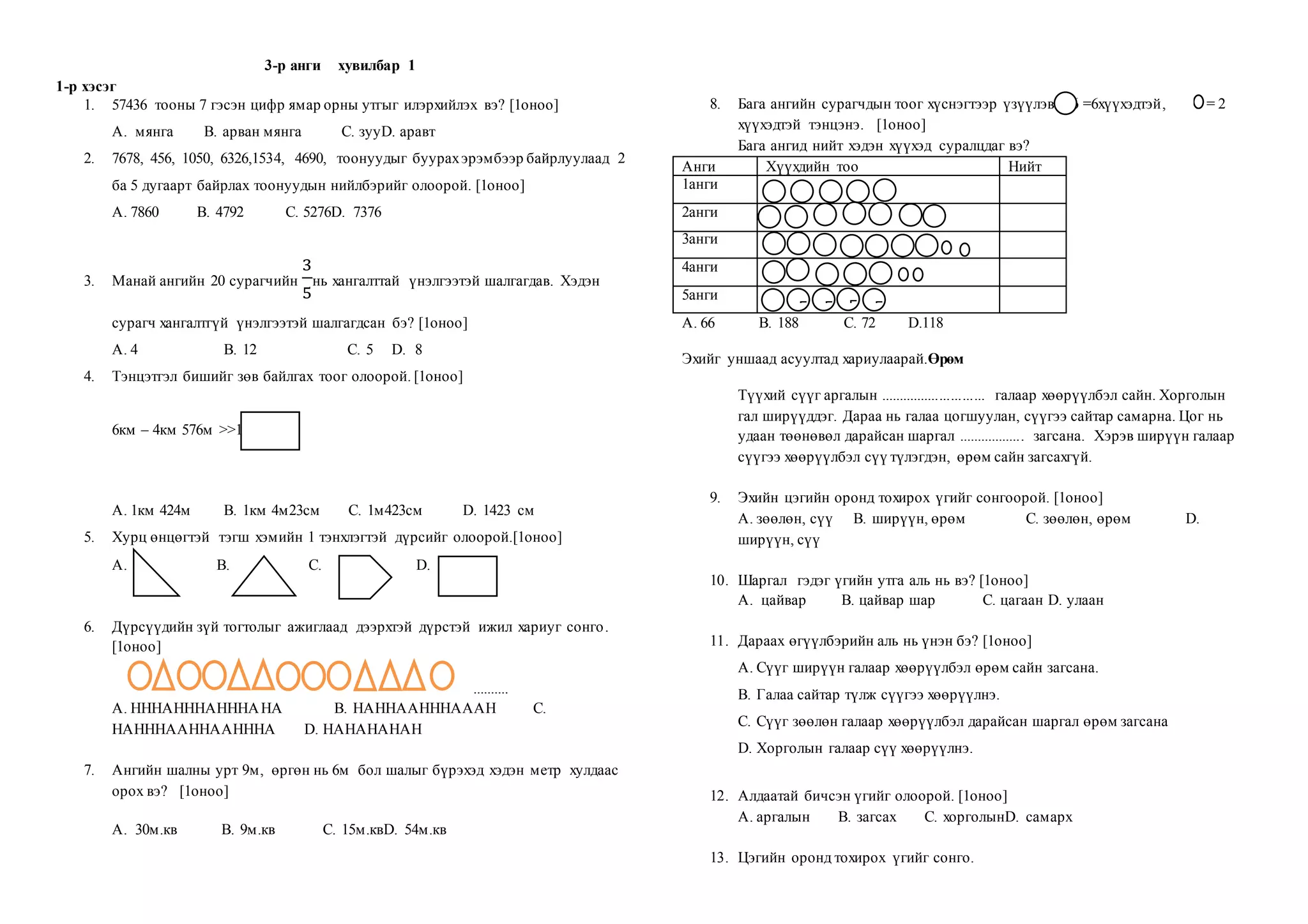 1. 57436 тооны 7 гэсэн цифр ямар орны утгыг илэрхийлэх вэ? [1оноо]