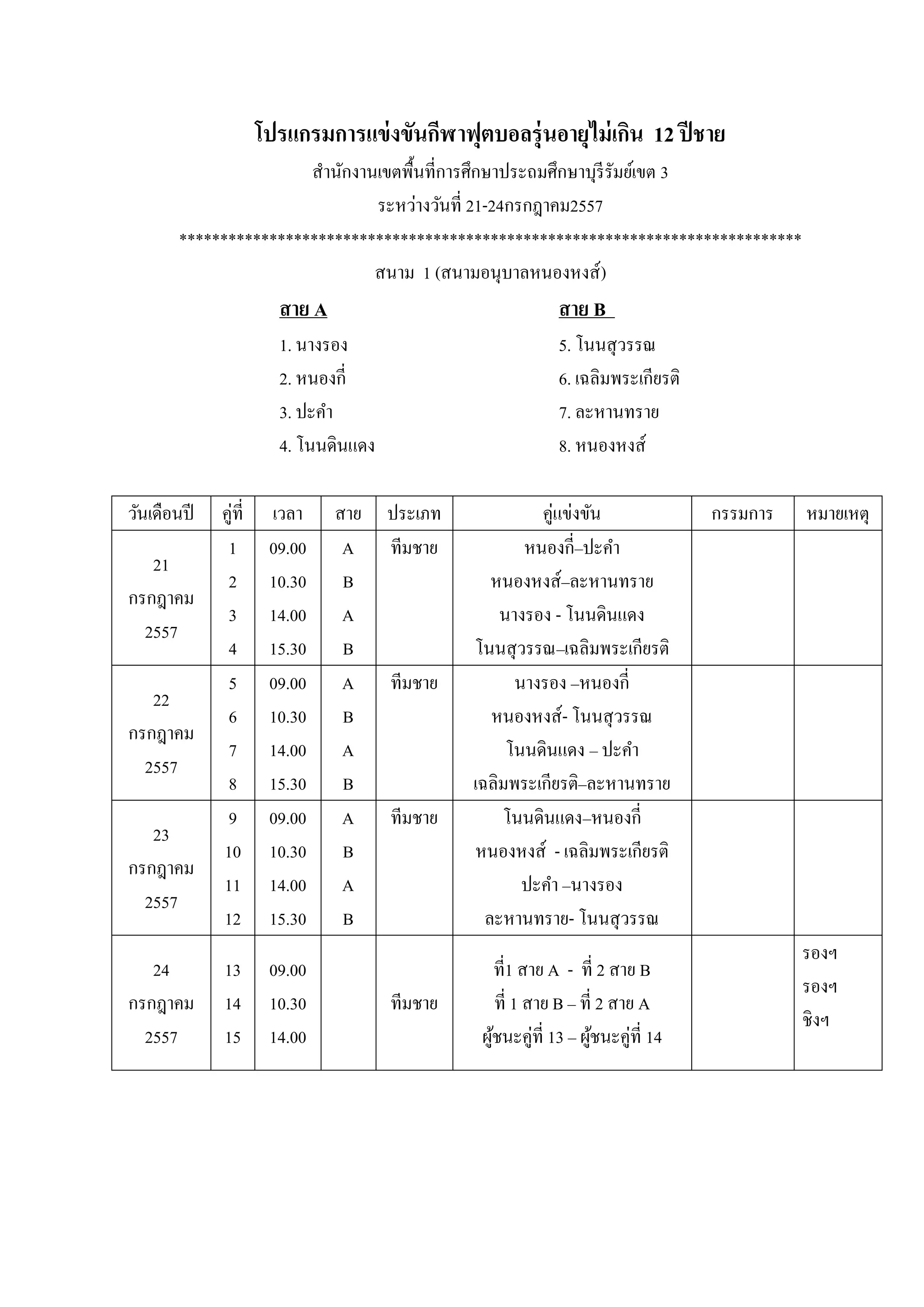 3 วันที23 กรกฎาคม 2557 **************************************************************************** สถานที่แข่งขันโรงเรียนบ้านโนนสูงน้อย วันที่ คู่ที่ เวลา ประเภท คู่แข่งขัน หมายเหตุ 23 ก.ค.57 1 เริ่ม 15ปี ชาย โนนสุวรรณพบ โนนดินแดง 2 09.00 น. 15ปี ชาย นางรองพบ ปะคา 3 15ปี ชาย หนองกี่พบ ละหานทราย 4 15ปี ชาย หนองหงส์พบ เฉลิมพระเกียรติ 5 09.00 น. 15ปี ชาย ผู้ชนะคู่ที่ 1................พบผู้ชนะคู่ที่ 2................. 6 15ปี ชาย ผู้ชนะคู่ที่ 3................พบผู้ชนะคู่ที่ 4................. 7 15ปี ชาย ผู้ชนะคู่ที่ 5................พบผู้ชนะคู่ที่ 6................. คู่ชิงชนะเลิศ โนนดินแดง โนนสุวรรณ นางรอง ปะคา หนองกี่ ละหานทราย เฉลิมพระเกียรติ หนองหงส์