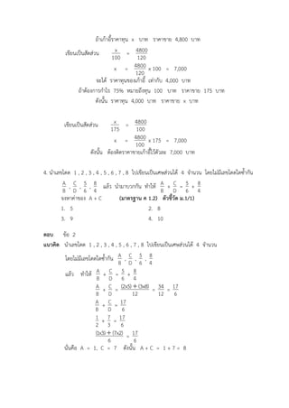 ราคาขาย 4,800 บาท เขียนเป็นสัดส่วน 100 x = 120 4800 x = 120 4800 x 100 = 7,000 จะได้ ราคาทุนของเก้าอี้ เท่ากับ 4,000 บาท ถ้าต้องการกาไร 75% หมายถึงทุน 100 บาท ราคาขาย 175 บาท ดังนั้น ราคาทุน 4,000 บาท ราคาขาย x บาท เขียนเป็นสัดส่วน 175 x = 100 4800 x = 100 4800 x 175 = 7,000 ดังนั้น ต้องติดราคาขายเก้าอี้ไว้ตัวละ 7,000 บาท 4. นาเลขโดด 1 , 2 , 3 , 4 , 5 , 6 , 7 , 8 ไปเขียนเป็นเศษส่วนได้ 4 จานวน โดยไม่มีเลขโดดใดซ้ากัน B A , D C , 6 5 , 4 8 แล้ว นามาบวกกัน ทาให้ B A + D C = 6 5 + 4 8 จงหาค่าของ A + C (มาตรฐาน ค 1.2) ตัวชี้วัด ม.1/1) 1. 5 2. 8 3. 9 4. 10 ตอบ ข้อ 2 แนวคิด นาเลขโดด 1 , 2 , 3 , 4 , 5 , 6 , 7 , 8 ไปเขียนเป็นเศษส่วนได้ 4 จานวน โดยไม่มีเลขโดดใดซ้ากัน B A , D C , 6 5 , 4 8 แล้ว ทาให้ B A + D C = 6 5 + 4 8 B A + D C = 12 )8x3()5x2( = 12 34 = 6 17 B A + D C = 6 17 2 1 + 3 7 = 6 17 6 )2x7()3x1( = 6 17 นั่นคือ A = 1, C = 7 ดังนั้น A + C = 1 + 7 = 8
