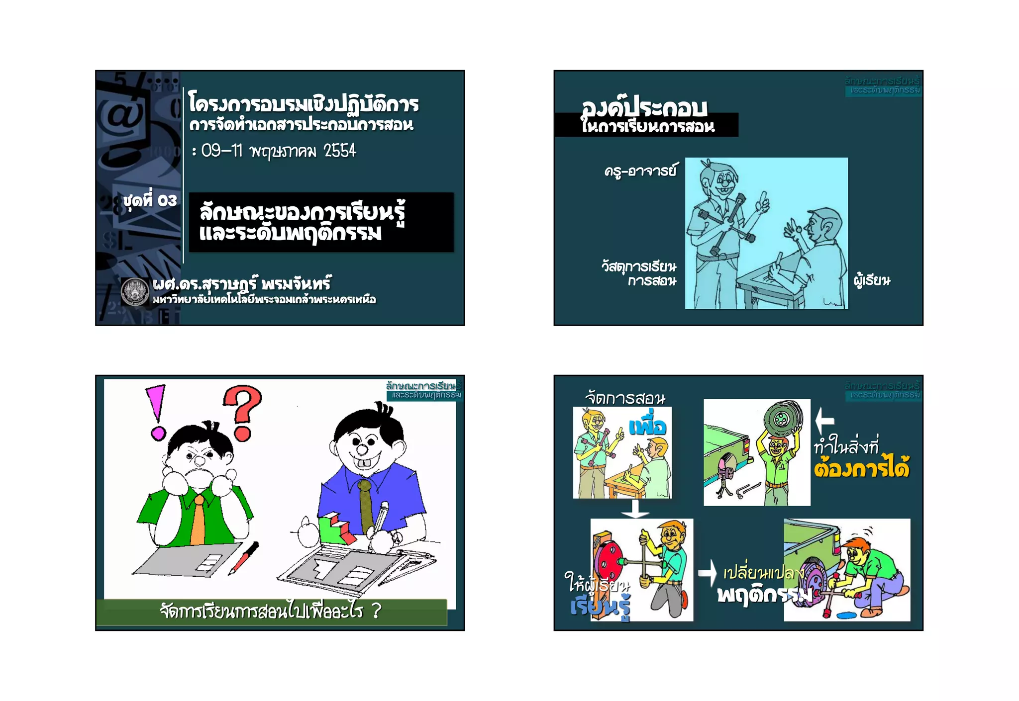 เทคนิคการสอนชุดที่ 3 การเรียนรู้และระดับพฤติกรรม โดย ผู้ช่วยศาสตราจารย์ ดร.สุราษฎร์ พรมจันทร์ ภาควิชาครุศาสตร์เครื่องกล คณะครุศาสตร์อุตสาหกรรม มหาวิทยาลัยเทคโนโลยีพระจอมเกล้าพระนครเหนือ