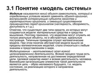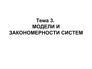 Документ описывает понятие модели системы и классифицирует модели на познавательные и прагматические, статические и динамические, а также абстрактные и материальные. Он также выделяет закономерности целеобразования и особенности моделей, такие как приближенность, адекватность и ингерентность. Важность моделирования подчеркивается как ключевой этап деятельности, а также рассматриваются разные типы структур и их применение в системном подходе.