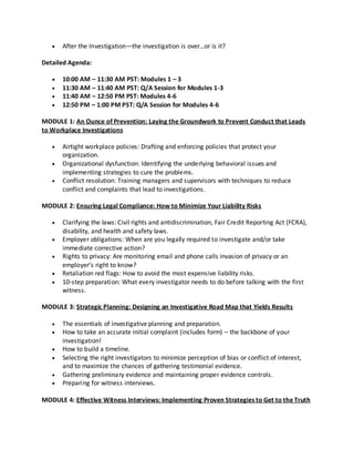 This virtual seminar provides best practices for conducting effective workplace investigations. It covers how to structure interviews to gather accurate information from reluctant or angry witnesses, how to assess credibility while considering facts over body language, and how to avoid retaliatory behavior. The seminar addresses employer compliance obligations, investigative planning, conducting interviews, overcoming barriers, documentation, and writing an effective final report. Attendees include HR managers and those with employee relations roles who need to conduct investigations or resolve disputes.