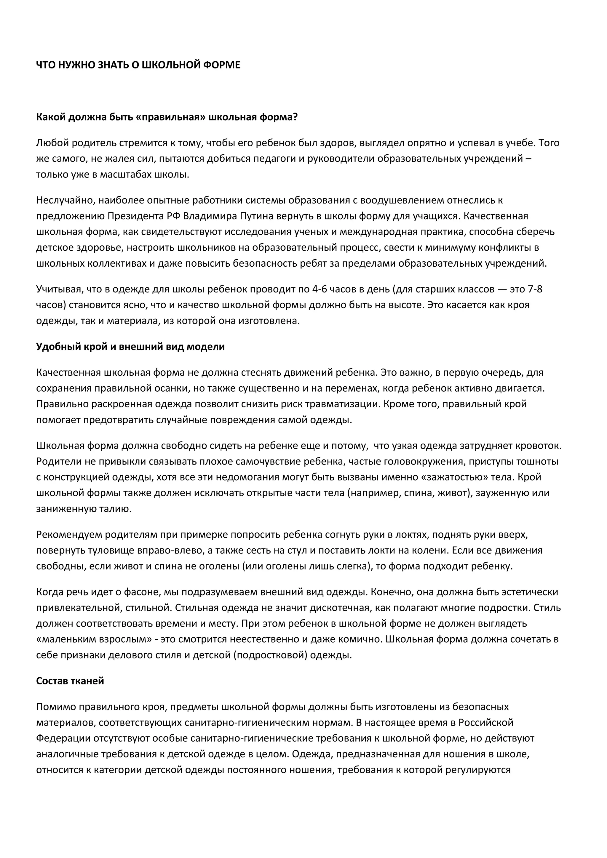 Документ обсуждает важность качественной школьной формы для здоровья и успеваемости детей, выделяя аспекты кроя, материала и ухода за одеждой. Школьная форма должна быть удобной, безопасной и стильной, соответствовать санитарно-гигиеническим нормам и легко поддаваться уходу. Ключевое внимание уделяется тому, что неправильный выбор одежды может вызвать дискомфорт и негативно сказаться на здоровье ребенка.