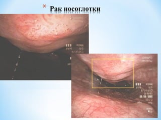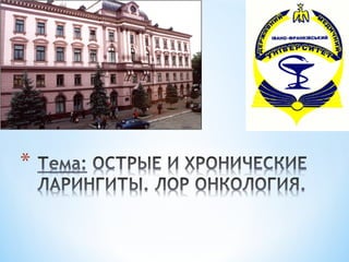 Документ подробно описывает хронический ларингит, его классификацию и факторы развития, включая различные предраковые состояния. Рассматриваются методы диагностики и лечения опухолей верхних дыхательных путей, наряду с данными по эпидемиологии и статистике. Упомянуты методы реабилитации и результаты лечения, а также указаны симптомы, сопровождающие опухолевые процессы.