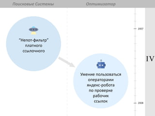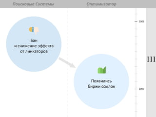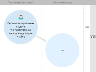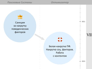 Документ обсуждает тенденции и рекомендации по SEO на 2014 год, начиная с его формирования с появления поисковых систем. Основное внимание уделяется качеству сайта, пользовательскому опыту и изменениям в политиках Яндекса и Google. Упоминаются важные факторы, такие как чистота кода, скорость загрузки и влияние социальных сигналов на продвижение.