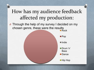 Through surveys and feedback from classmates, the document discusses how an artist's audience influenced their music video, magazine advertisement, and album packaging designs. The surveys showed a preference for rock, pop and indie music genres. Classmates provided feedback that led the artist to include a narrative in their music video as well as choose simple, consistent designs for the magazine ad and digipak that featured the album cover art.