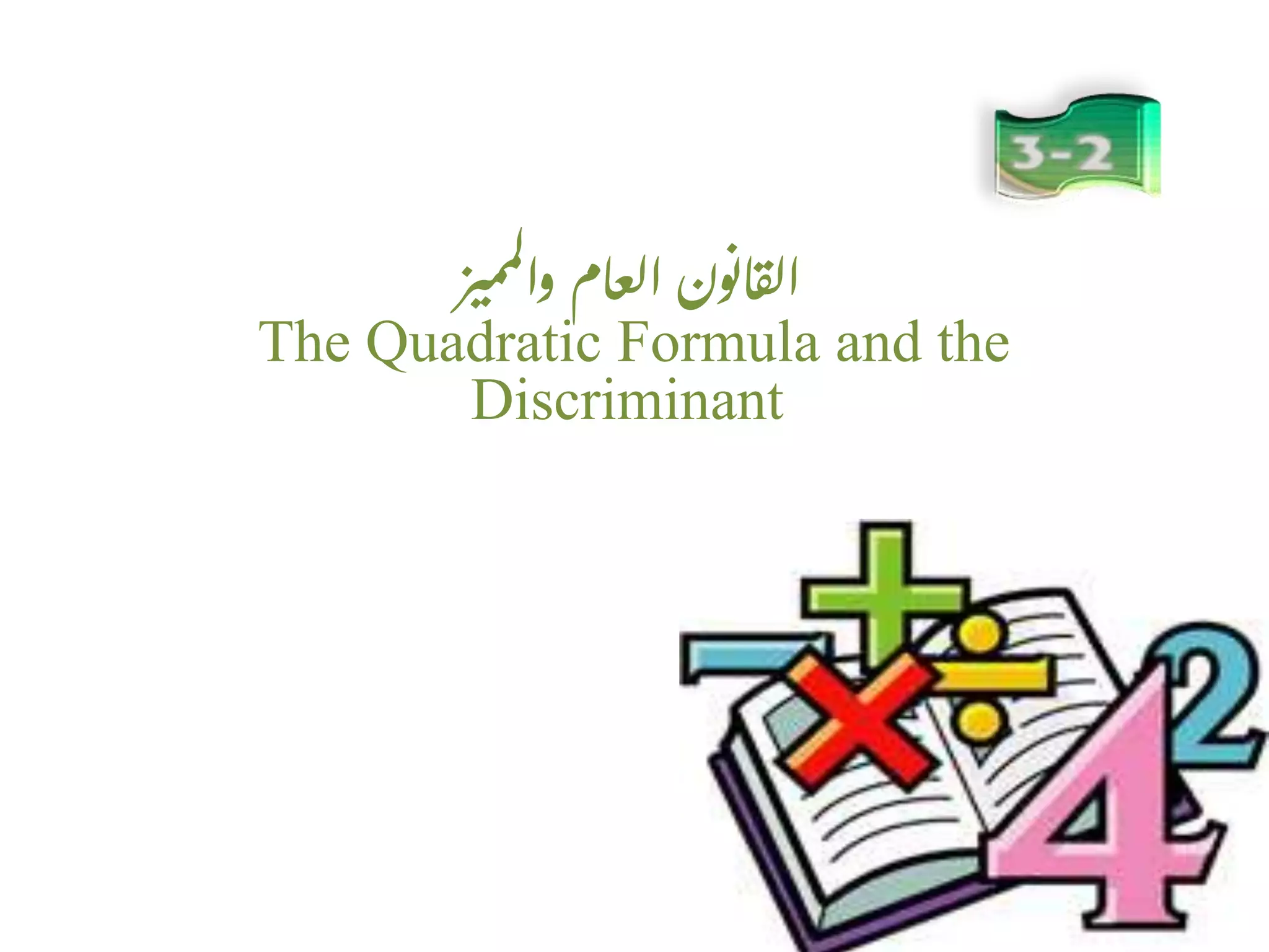 The document discusses the quadratic formula and discriminant. The quadratic formula is used to solve quadratic equations and is expressed as x = (-b ± √(b^2 - 4ac)) / 2a. The discriminant (b^2 - 4ac) determines the number and type of solutions, with different values corresponding to two real solutions, one real solution, or two complex solutions.