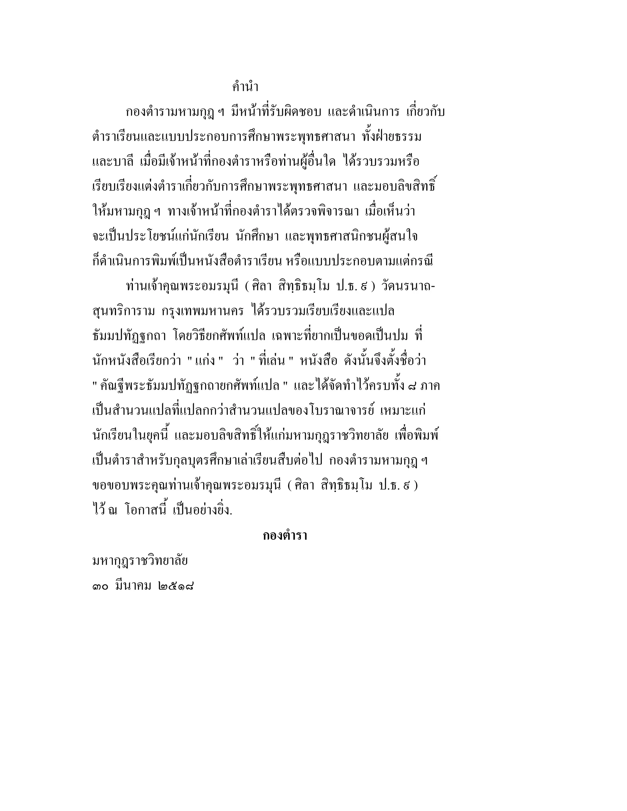 ยกศัพทแปล ภาค ๕ - หนาที่ 104 เยหิ ทฺวีหิ โคเณหิ ดวยโค ท. ๒ เหลาใด ( เต ) เทฺว โคณา อ. โค ท. ๒ เหลานั้น เม ของขาพระพุทธเจา ( อตฺถิ ) มีอยู เทว ขาแต สมมติเทพ เตสุ ทฺวีสุ โคเณสุ ในโค ท. ๒ เหลานั้นหนา เอโก โคโณ อ. โคตัวหนึ่ง มโต ตายเสียแลว ขตฺติย ขาแตพระกษัตริยเจา ตฺว อ. พระองค เทหิ ขอจงทรงพระราชทาน ทุติย โคณ ซึ่งโคตัวที่สองเถิด อิติ ดังนี้ ฯ โส พฺราหฺมโณ อ. พราหมณนั้น กตฺวา กระทําแลว ต คาถ ซึ่งคาถานั้น ปคุณ ใหคลองแคลว สวจฺฉรมตฺเตน กาเลน โดยกาล อันมีปเปนประมาณ อาโรเจตฺวา บอกแลว ( ตสฺสา คาถาย ) ปคุณภาว ซึ่งความที่แหงคาถานั้น เปนคาถาคลองแคลว ปุตฺตสฺส แกบุตร ( วจเน ) ครั้นเมื่อคําวา ตาต ขาแตคุณพอ เตนหิ ถาอยางนั้น ตุมฺเห อ. ทาน ท. อาทาย จงถือเอาแลว ปณณาการ ซึ่งเครื่อง บรรณาการ กฺจิเอว บางอยางนั่นเทียว อาคจฺฉถ จงมาเถิด อห อ. ผม คนฺตฺวา จักไปแลว ปุริมตร กอนกวา สฺสามิ จักยืนอยู สนฺติเก ในสํานัก รฺโ ของพระราชา อิติ ดังนี้ ( โสมทตฺเตน ) อันมหาดเล็กชื่อวาโสมทัต วุตฺเต กลาวแลว ( วตฺวา ) กลาวแลววา ตาต แนะพอ สาธุ อ. ดีละ อิติ ดังนี้ คเหตฺวา ถือเอาแลว ปณฺณาการ ซึ่งเครื่องบรรณาการ อุสฺสาหปฺปตฺโต ผูถึงแลวซึ่งความ อาจหาญขึ้น คนฺตฺวา ไปแลว ราชกุล สูตระกูลของพระราชา