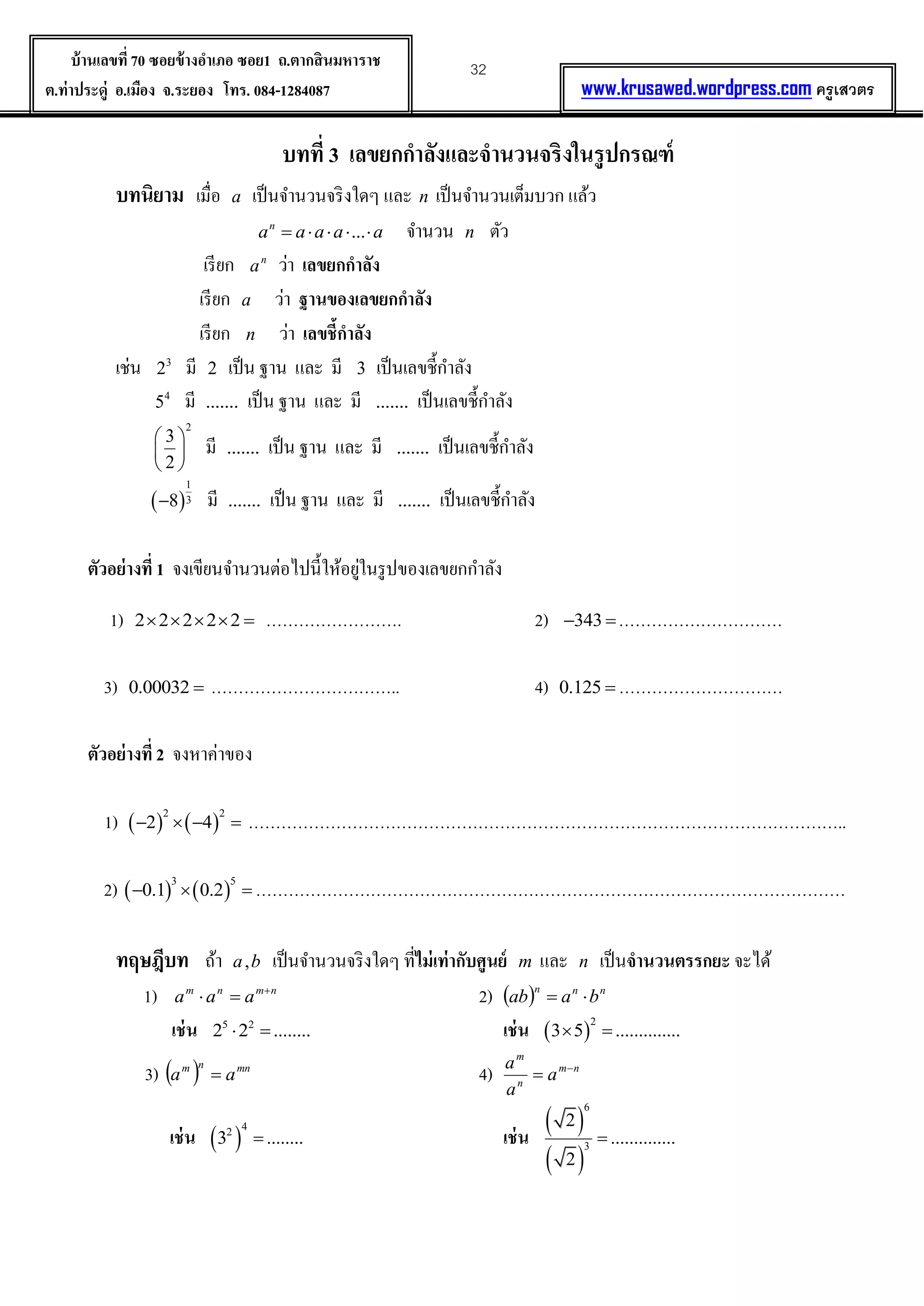ถ.ตากสินมหาราช ต.ท่าประดู่ อ.เมือง จ.ระยอง โทร. 084-1284087 www.krusawed.wordpress.com ครูเสวตร บทที่ 3 เลขยกกาลังและจานวนจริงในรูปกรณฑ์ บทนิยาม เมื่อ a เป็นจำนวนจริงใดๆ และ n เป็นจำนวนเต็มบวก แล้ว aaaaan ... จำนวน n ตัว เรียก n a ว่ำ เลขยกกาลัง เรียก a ว่ำ ฐานของเลขยกกาลัง เรียก n ว่ำ เลขชี้กาลัง เช่น 3 2 มี 2 เป็น ฐำน และ มี 3 เป็นเลขชี้กำลัง 4 5 มี ....... เป็น ฐำน และ มี ....... เป็นเลขชี้กำลัง 2 3 2 มี ....... เป็น ฐำน และ มี ....... เป็นเลขชี้กำลัง 1 38 มี ....... เป็น ฐำน และ มี ....... เป็นเลขชี้กำลัง ตัวอย่างที่ 1 จงเขียนจำนวนต่อไปนี้ให้อยู่ในรูปของเลขยกกำลัง 1) 2 2 2 2 2 ……………………. 2) 343 ………………………… 3) 0.00032 …………………………….. 4) 0.125 ………………………… ตัวอย่างที่ 2 จงหำค่ำของ 1) 2 2 2 4 ……………………………………………………………………………………………….. 2) 3 5 0.1 0.2 ……………………………………………………………………………………………… ทฤษฎีบท ถ้ำ ba, เป็นจำนวนจริงใดๆ ที่ไม่เท่ากับศูนย์ m และ n เป็นจานวนตรรกยะ จะได้ 1) nmnm aaa 2) nnn baab เช่น 5 2 2 2 ........ เช่น 2 3 5 .............. 3) mnnm aa 4) nm n m a a a เช่น 4 2 3 ........ เช่น 6 3 2 .............. 2