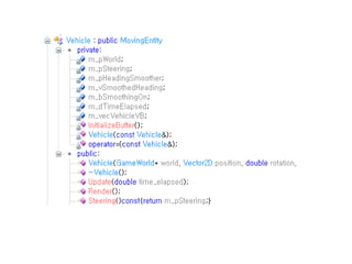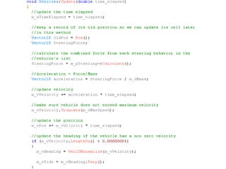 운반기의 물리적 현상갱신하기 조종힘 계산 . Calculate() 은 모든 운반기의 활성화된 조종 행동들을 합계하여 총 조종힘을 반환 조종힘을 가속도로 변환 가속도로 속도를 갱신 운반기의 위치를 새로운 속도로 갱신 방향은 속도에 따라 정렬되어야 하므로 , 정규화된 속도 벡터와 동등함을 유지하면서 갱신 운반기의 속도가 임계값 이상이어야만 계산