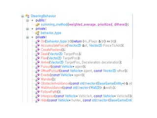 #33 MAGENTA: 운반기의 속도 BLUE: 조종힘 The leader following behavior combines separation (a desire to avoid crowding) and arrival (a desire to move towards a point, slowing as it draws near). 도착하기 ‘ 찾기 ’ 보다 훨씬 유연한 움직임을 제공 . 운반기의 최대 속도와 최대힘의 설정에는 그다지 의존하지 않기 때문에 보다 더 사용됨 . ‘ 찾기 ’ 는 오히려 follow 들이 leader 를 공격하는 것 처럼 보일 수도 … 예 반대편 마크 우주선에 도킹 비행기 뒤 쫓아가기 전투 대형들을 구현하기