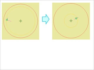 #24 MAGENTA: 운반기의 속도 BLUE: 조종힘 CYAN: 조종 방향 배회 방향 ( 빨간점 ) 수정된 배회 방향은 검은원 (r:2) 에 놓여 있도록 제한된다 . strength : 0~1 범위의 힘은 흰선을 따라 밖으로 나가려는 빨간점의 움직임으로 고려될 수 있다 . rate : 배회 방향이 얼마나 빨리 바뀌는지를 제어하는 0~1 범위의 비율은 , 흰원 (r:0.6) 의 반지름으로 표현된다 .