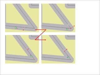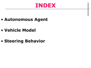 #28 MAGENTA: 운반기의 속도 BLUE: 조종힘 움직일 때 벽과 주어진 거리를 유지하는 것이 목적 현재 속도에 기반한 ‘ 미래의 위치 ( 껌점 ) ’ 를 예측 미래의 위치는 ‘ 벽의 최근접점 ( 빨점 ) ’ 으로 투영 ‘ 벽의 노말 ( 빨선 ) ’ 을 따라서 ‘ 벽의 최근접점 ( 빨점 ) ’ 을 원하는 OFFSET 만큼 이동시키면 ‘ 타겟점 ( 빨원 ) ’ 을 구할 수 있다 . 최종적으로 타겟점으로 SEEK 행동을 사용한다 .