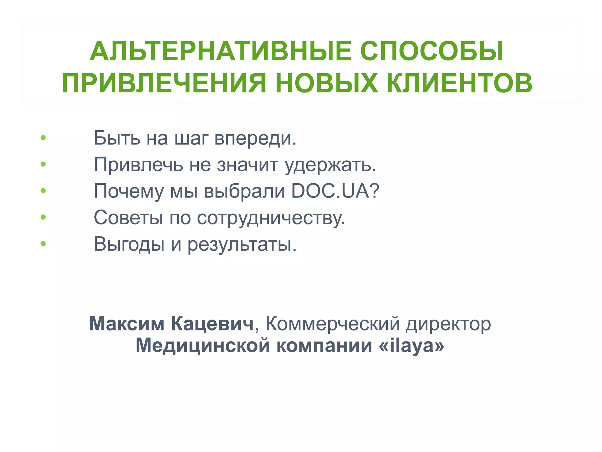 Документ обсуждает альтернативные способы привлечения новых клиентов для медицинской компании ilaya, акцентируя внимание на важности удержания клиентов и эффективном использовании сервиса doc.ua. Приведены преимущества работы с платформой, включая высокую конверсию и точность диагностики, а также значимость честных отзывов для повышения доверия клиентов. Также упоминаются советы по сотрудничеству и значимость визуального оформления информации.