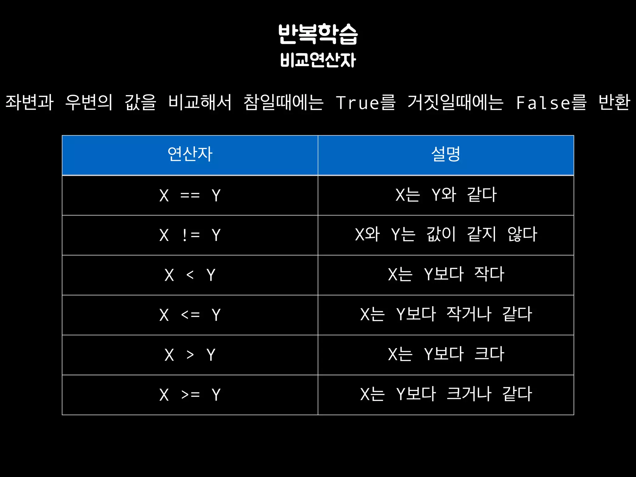 좌변과우변의 값을 비교해서 참일때에는 True를 거짓일때에는 False를 반환