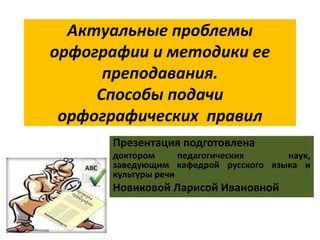 Документ обсуждает проблемы орфографии и методы ее преподавания в России, подчеркивая проблемы низкой грамотности из-за недостатков государственной политики, социального престижа русского языка и беспомощности методической науки. Основные причины низкой грамотности включают недостаточную мотивацию учащихся, сложности в правилах написания и отсутствие унификации норм. Также рассматриваются трудности применения орфографических правил и приводятся примеры ошибок и их причин.