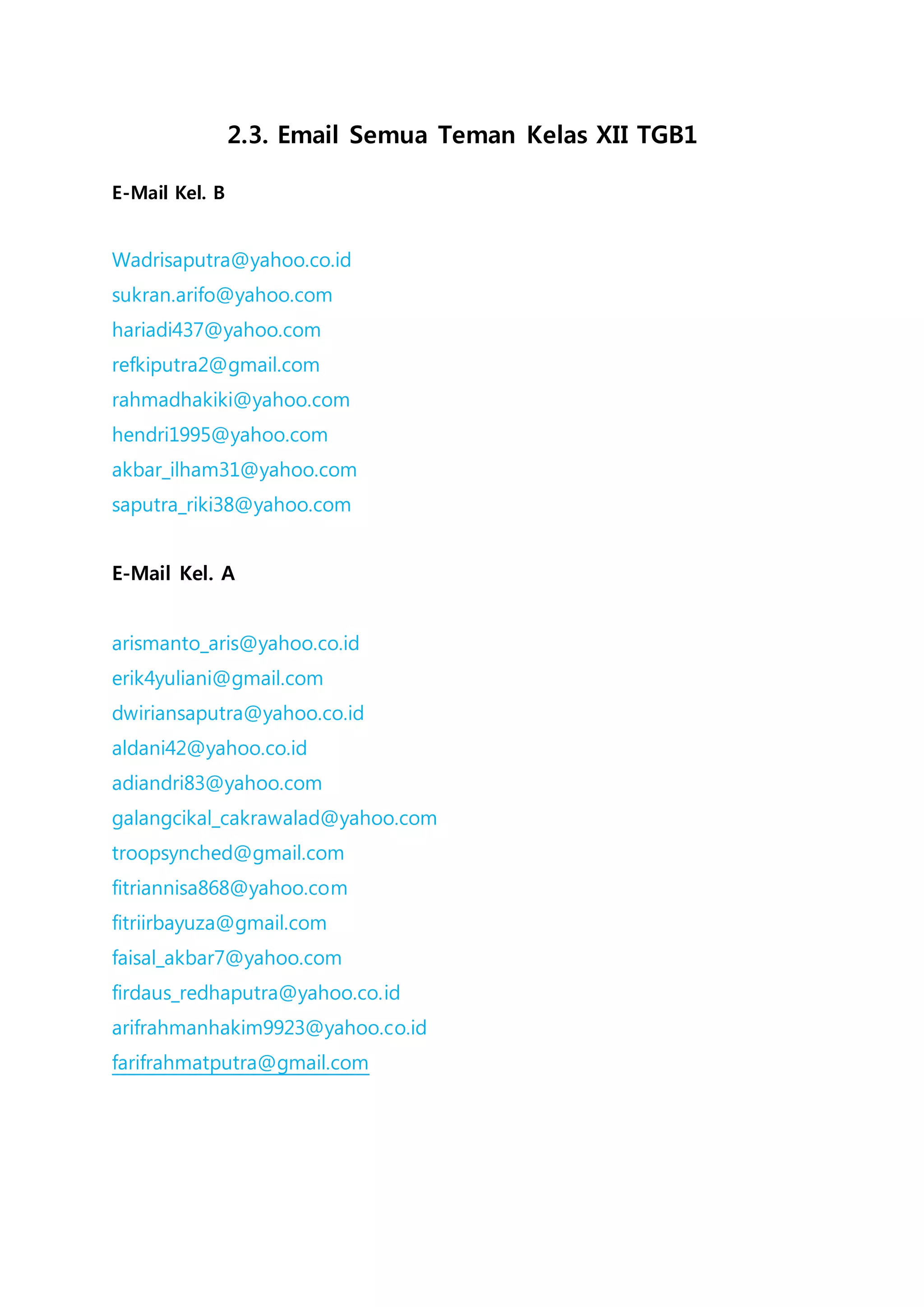 This document lists the email addresses of students from two classes, Class XII TGB1 Kelas B and Kelas A. It includes 13 email addresses for Kelas B and 12 email addresses for Kelas A. The emails are provided to easily contact all students from these two classes.