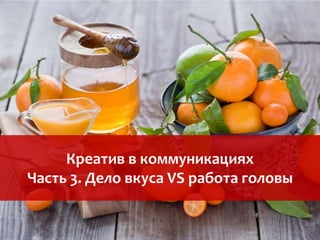 Документ рассматривает различные подходы к оценке креативности в коммуникациях, разделяя субъективные и объективные методы. Он описывает важность понимания потребностей клиентов и использования инсайтов для создания эффективного креатива. Обсуждаются различные методы исследования аудитории, включая опросы, анализ документов и наблюдение.