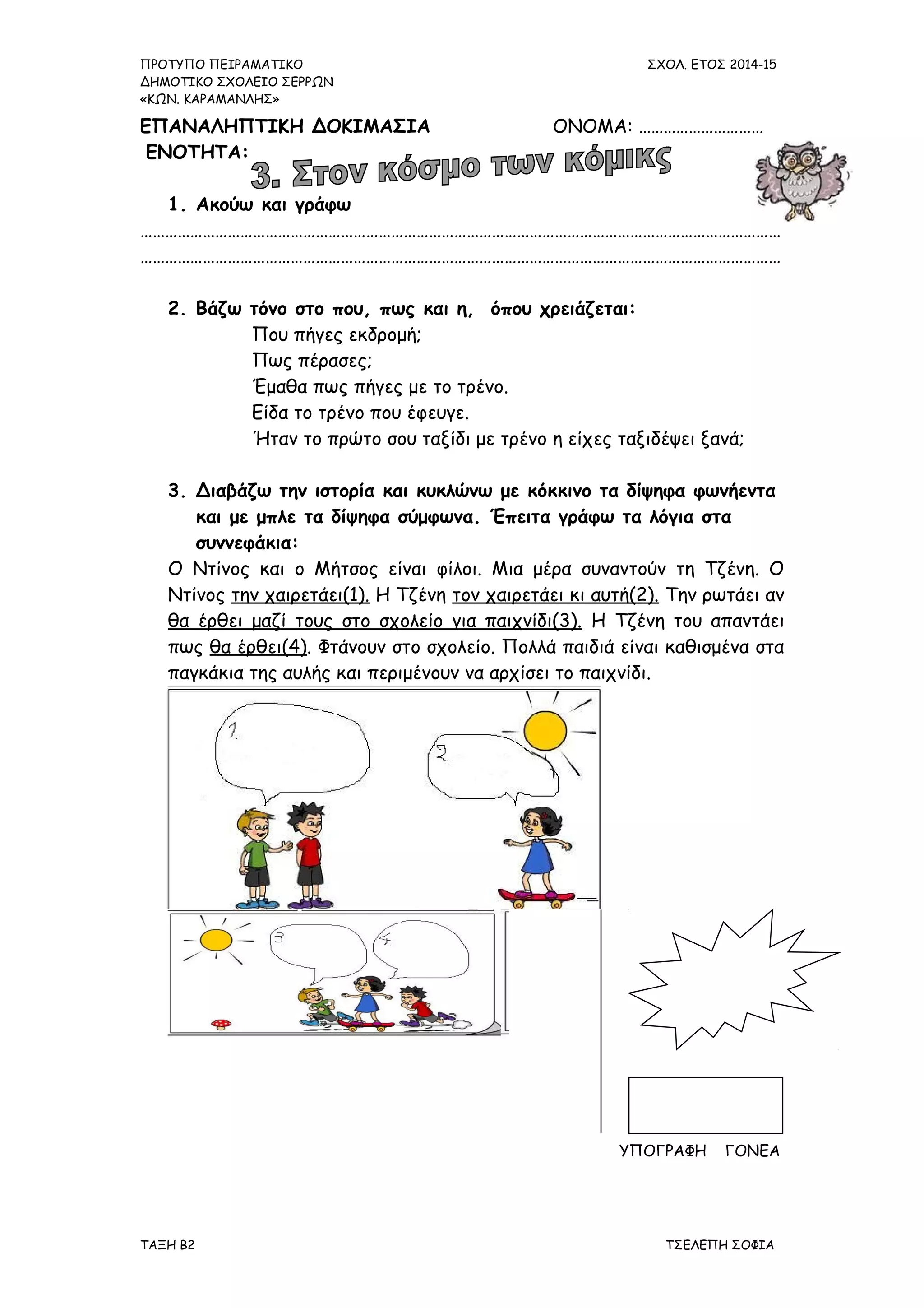 ΕΠΑΝΑΛΗΠΤΙΚΗ ΔΟΚΙΜΑΣΙΑ ΕΝΟΤΗΤΑ 3. Στον κόσμο των κόμικς, Γλώσσα, Β τάξη