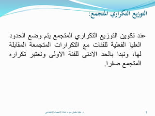 يتناول المستند أهداف محاضرة حول تكوين التوزيع التكراري المتجمع، ويتضمن كيفية تمثيل التوزيعات بيانيًا. يستعرض المستند أمثلة عملية تشمل رسم المدرج التكراري، المضلع التكراري، والمنحنى التكراري بناءً على بيانات درجات امتحان الطالبات.