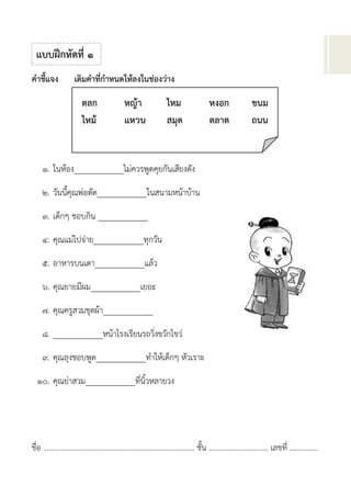 ............................... เลขที่ ............... คำชี้แจง เติมคำที่กำหนดให้ลงในช่องว่ำง ๑. ____________เอามือแหย่ปลั๊กไฟ ๒. ฉันชอบกินผลไม้หลาย____________ ๓. ฉันดูแลน้อง____________บ้าน ๔. คุณครูเป็นแบบ____________ที่ดีของนักเรียน ๕. ในห้องเรียน____________ส่งเสียงดัง ๖. คุณพ่อ____________ดื่มกาแฟตอนเช้า ๗. นักเรียนเล่น____________ในสนามเด็กเล่น ๘. คุณพ่อคุณแม่____________ให้ลูกเป็นเด็กดี ๙. พี่นอนเล่นบนเตียง____________สบายใจ ๑๐. คุณแม่ทาอาหาร____________ในห้องครัว อย่า อยู่ อย่าง อยาก แบบฝึกหัดที่ ๒