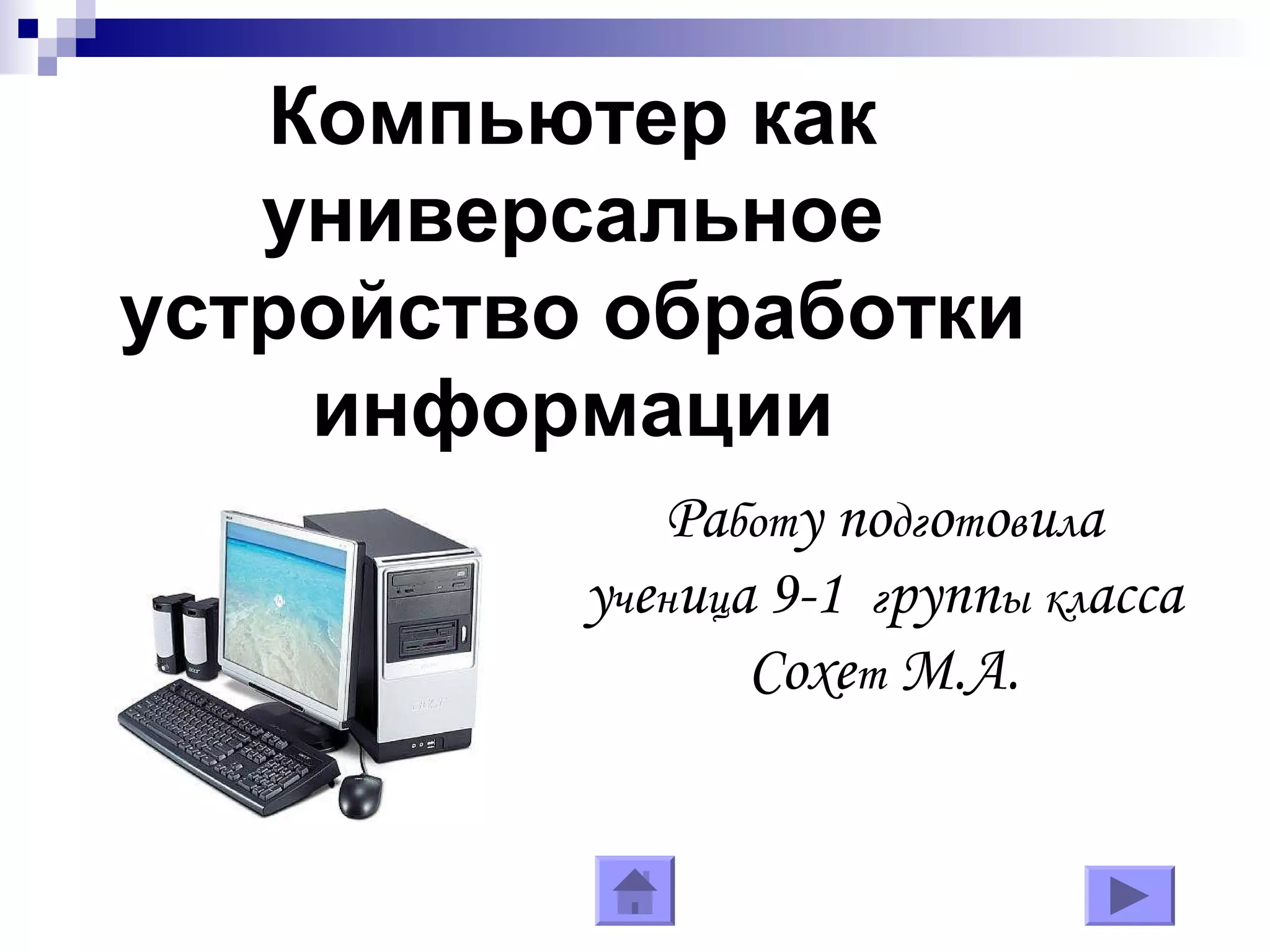 Документ описывает компьютер как универсальное устройство обработки информации, включая основные компоненты, такие как процессор, оперативная память и устройства ввода/вывода. Упоминается процессор Pentium 4, который выполняет 3 миллиарда операций в секунду и содержит 42 миллиона элементов. Кроме того, рассматриваются различные типы памяти и перечисляются устройства ввода и вывода.