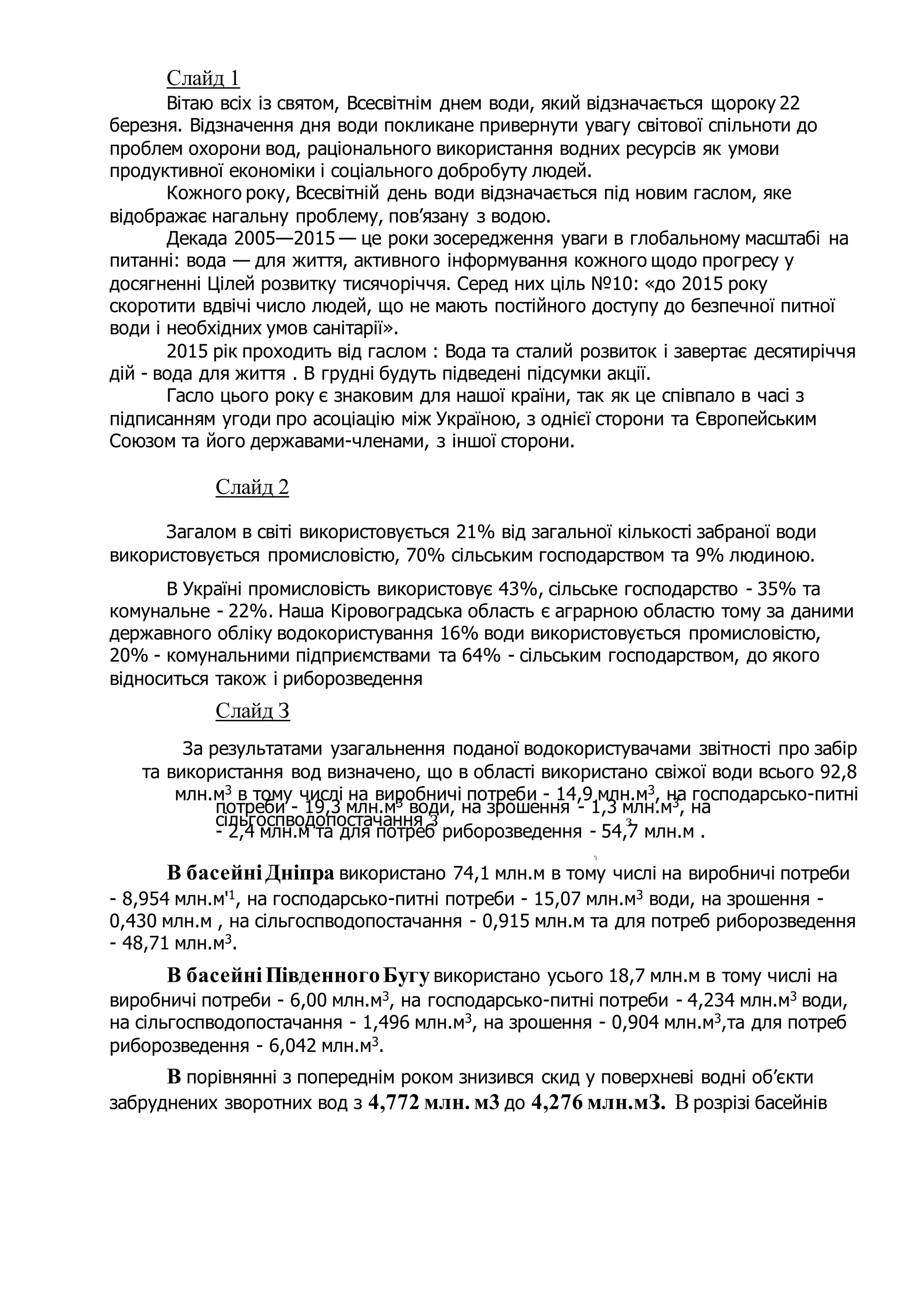 виробничі потреби - 6,00 млн.м3, на господарсько-питні потреби - 4,234 млн.м3 води,