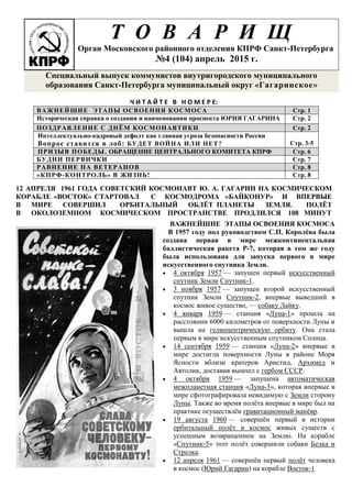 Документ включает в себя специальный выпуск, посвященный истории освоения космоса и полету Юрия Гагарина, с акцентом на значимости событий для Советского Союза и современности. В нем также рассматриваются вопросы безопасности России и вероятность войны с Западом, подчеркивается недостаточная готовность экономики к возможным военным действиям. Основное внимание уделяется необходимости восстановления обороноспособности и развития интеллектуального потенциала страны.