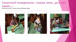 Документ описывает мероприятия книжной недели для детей в группе №3, включая чтение сказок и знакомство с детскими журналами. Особое внимание уделяется ежедневным темам, таким как 'сказочный понедельник' и 'ярмарка книжных фантазий'. Завершением недели стала выставка детских рисунков, посвященная любимым книгам.