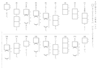 * か ん 字 テ ス ト ・ 三 年 生 ( )20 に 当 て は ま る か ん 字 を 、 に お く り が な を 書 き ま し ょ う 。 ( ) こ の プ リ ン ト は ウ ェ ブ サ イ ト で 無 料 ダ ウ ン ロ ー ド で き ま す 。 小 学 生 の 学 習 教 材 【 チ ビ む す ド リ ル 】 (2) (1)(3)(4)(5)(6)(7) ※ 書 け な か った 漢 字 を 練 習 し ま し ょ う 。 古 い や か た 親 鳥 が ひ な を ( ) は ぐ く む 。 ( ) す べ て を 知 る 。 ス ピ ー ド がの 人 に た の む 。 ほ か ( ) は や ま る 。 ボ ー ル を ( ) ほ う る 。 ま じ め に 話 を す る 。