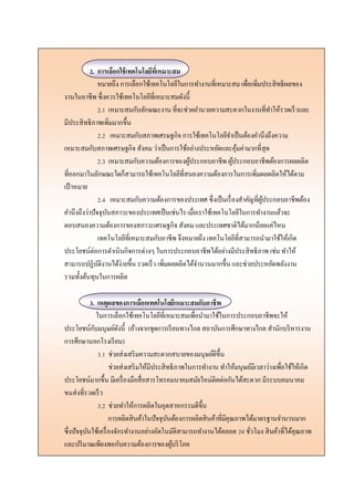 เพื่อเพิ่มประสิทธิผลของ งานในอาชีพ ซึ่งควรใช้เทคโนโลยีที่เหมาะสมดังนี้ 2.1 เหมาะสมกับลักษณะงาน ที่จะช่วยอานวยความสะดวกในงานที่ทาให้รวดเร็วและ มีประสิทธิภาพเพิ่มมากขึ้น 2.2 เหมาะสมกับสภาพเศรษฐกิจ การใช้เทคโนโลยีจาเป็นต้องคานึงถึงความ เหมาะสมกับสภาพเศรษฐกิจ สังคมว่าเป็นการใช้อย่างประหยัดและคุ้มค่ามากที่สุด 2.3 เหมาะสมกับความต้องการของผู้ประกอบอาชีพ ผู้ประกอบอาชีพต้องการผลผลิต ที่ออกมาในลักษณะใดก็สามารถใช้เทคโนโลยีที่สนองความต้องการในการเพิ่มผลผลิตให้ได้ตาม เป้าหมาย 2.4 เหมาะสมกับความต้องการของประเทศ ซึ่งเป็นเรื่องสาคัญที่ผู้ประกอบอาชีพต้อง คานึงถึงว่าปัจจุบันสภาวะของประเทศเป็นเช่นไร เมื่อเราใช้เทคโนโลยีในการทางานแล้วจะ ตอบสนองความต้องการของสภาวะเศรษฐกิจ สังคม และประเทศชาติได้มากน้อยแค่ไหน เทคโนโลยีที่เหมาะสมกับอาชีพ จึงหมายถึง เทคโนโลยีที่สามารถนามาใช้ให้เกิด ประโยชน์ต่อการดาเนินกิจการต่างๆ ในการประกอบอาชีพได้อย่างมีประสิทธิภาพ เช่น ทาให้ สามารถปฏิบัติงานได้ง่ายขึ้น รวดเร็ว เพิ่มผลผลิตได้จานวนมากขึ้น และช่วยประหยัดพลังงาน รวมทั้งต้นทุนในการผลิต 3. เหตุผลของการเลือกเทคโนโลยีเหมาะสมกับอาชีพ ในการเลือกใช้เทคโนโลยีที่เหมาะสมเพื่อนามาใช้ในการประกอบอาชีพจะให้ ประโยชน์กับมนุษย์ดังนี้ (อ้างจากชุดการเรียนทางไกล สถาบันการศึกษาทางไกล สานักบริหารงาน การศึกษานอกโรงเรียน) 3.1 ช่วยส่งเสริมความสะดวกสบายของมนุษย์ดีขึ้น ช่วยส่งเสริมให้มีประสิทธิภาพในการทางาน ทาให้มนุษย์มีเวลาว่างเพื่อใช้ให้เกิด ประโยชน์มากขึ้น มีเครื่องมือสื่อสารโทรคมนาคมสมัยใหม่ติดต่อกันได้สะดวก มีระบบคมนาคม ขนส่งที่รวดเร็ว 3.2 ช่วยทาให้การผลิตในอุตสาหกรรมดีขึ้น การผลิตสินค้าในปัจจุบันต้องการผลิตสินค้าที่มีคุณภาพได้มาตรฐานจานวนมาก ซึ่งปัจจุบันใช้เครื่องจักรทางานอย่างอัตโนมัติสามารถทางานได้ตลอด 24 ชั่วโมง สินค้าที่ได้คุณภาพ และปริมาณเพียงพอกับความต้องการของผู้บริโภค