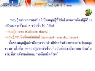 (ว30223) โดย: ครูศิริวุฒิ บัวสมาน ทฤษฎีจลนพลศาสตร์เคมีเป็นทฤษฎีที่ใช้อธิบายการเกิดปฏิกิริยา เคมีของสารตั้งแต่ 2 ชนิดขึ้นไป ได้แก่ - ทฤษฎีการชน (Collision theory) - ทฤษฎีสารเชิงซ้อนกัมมันต์ (Activated – complex theory) ทั้งสองทฤษฎีกล่าวถึงการชนอย่างมีประสิทธิภาพระหว่างโมเลกุล ของสารตั้งต้น แต่ทฤษฎีสารเชิงซ้อนกัมมันต์กล่าวถึงรายละเอียดใน ขณะที่สารเข้าชนกันและการเกิดผลิตภัณฑ์