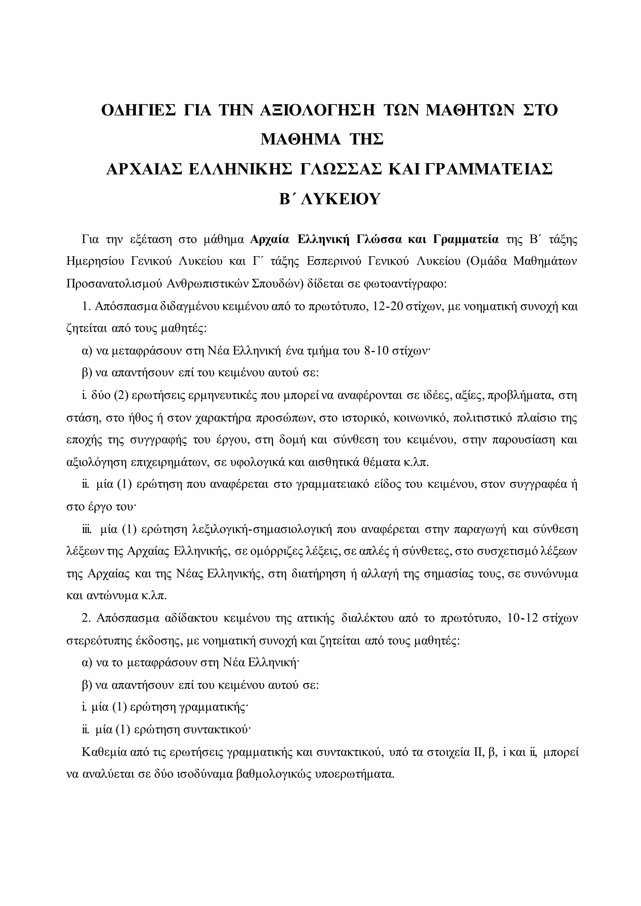 Για την εξέταση στο μάθημα Αρχαία Ελληνική Γλώσσα και Γραμματεία της Β΄ τάξης