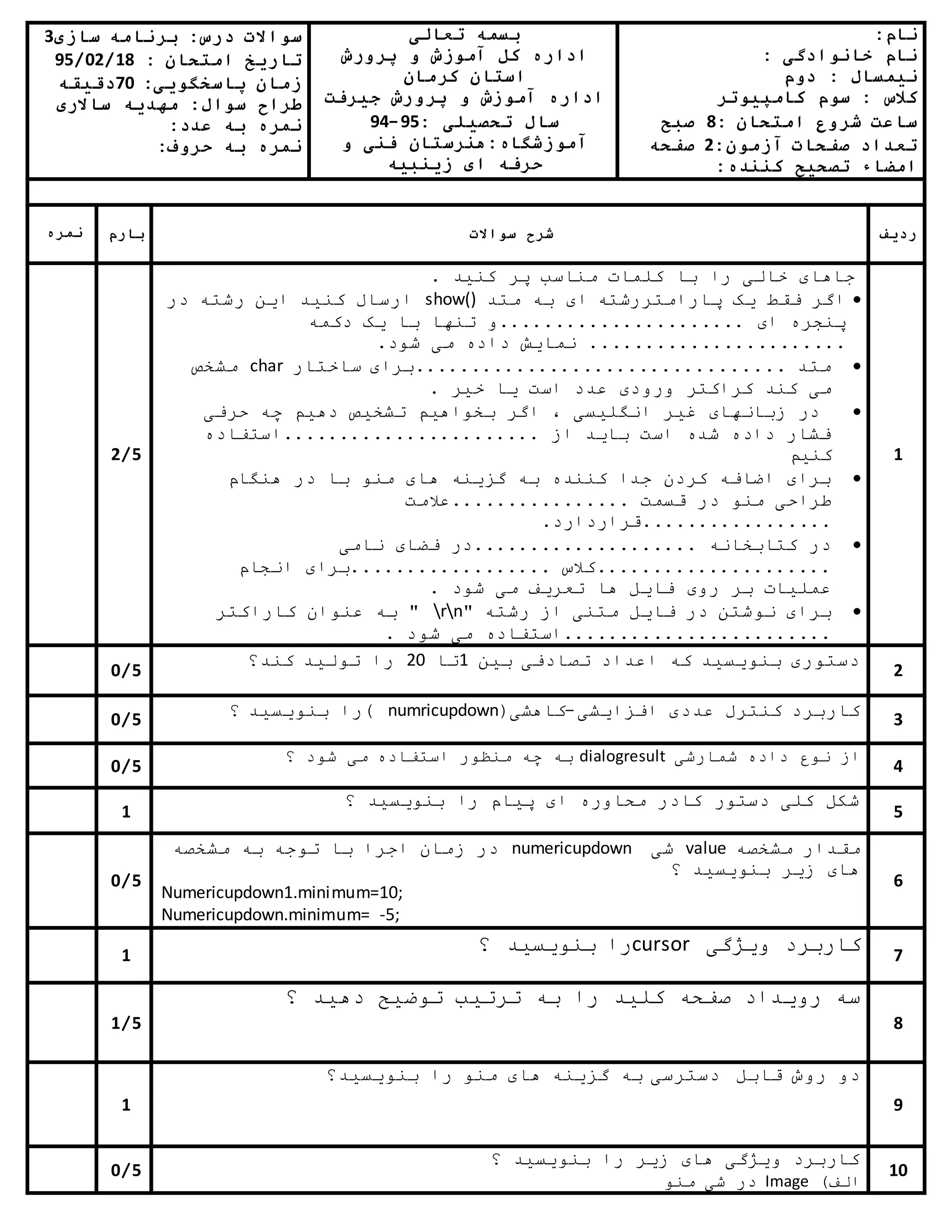 امتحان تاریخ81/20/59 :پاسخگویی زمان72دقیقه :سوال طراحمهدیهساالری :عدد به نمره :حروف به نمره تعالی بسمه پرورش و آموزش کل اداره کرمان استان جیرفت پرورش و آموزش اداره : تحصیلی سال59-59 و فنی آموزشگاه:هنرستان زینبیه ای حرفه :نام : خانوادگی نام : نیمسالدوم کالسسوم :کامپیوتر : امتحان شروع ساعت1صبح :آزمون صفحات تعداد0صفحه :کننده تصحیح امضاء نمره بارم سواالت شرح ردیف 9/0 کنی پر مناسب کلمات با را خالی جاهاید. متد به ای پارامتررشته یک فقط اگرshow()ر این کنید ارسالدر شته .............. ای پنجرهدکمه یک با تنها ........و ........................شود می داده نمایش ساختار .................................برای متدcharمشخص . خیر یا است عدد ورودی کراکتر کند می تشخیص بخواهیم اگر ، انگلیسی غیر زبانهای درحرفی چه دهیم .......................استفاده از باید است شده داده فشار کنیم هنگام در با منو های گزینه به کننده جدا کردن اضافه برای ................عالمت قسمت در منو طراحی ..................قراردارد نامی فضای ....................در کتابخانه در انجام ..................برای .....................کالس . شود می تعریف ها فایل روی بر عملیات " رشته از متنی فایل در نوشتن برایrnکاراکتر عنوان به " . شود می ........................استفاده 8 9/2 بین تصادفی اعداد که بنویسید دستوری1تا02کند؟ تولید را 0 9/2 افزایشی عددی کنترل کاربرد-(کاهشیnumricupdown؟ بنویسید )را 3 9/2 شمارشی داده نوع ازdialogresult؟ شود می استفاده منظور چه به 9 8 ؟ بنویسید را پیام ای محاوره کادر دستور کلی شکل 9 9/2 مشخصه مقدارvalueشیnumericupdownمشخصه به توجه با اجرا زمان در ؟ بنویسید زیر های Numericupdown1.minimum=10; Numericupdown.minimum= -5; 6 8 ویژگی کاربردcursor؟ بنویسید را 7 9/8 ؟ دهید توضیح ترتیب به را کلید صفحه رویداد سه 1 8 قابل روش دوبنویسید؟ را منو های گزینه به دسترسی 5 9/2 ؟ بنویسید را زیر های ویژگی کاربرد )الفImageمنو شی در 82