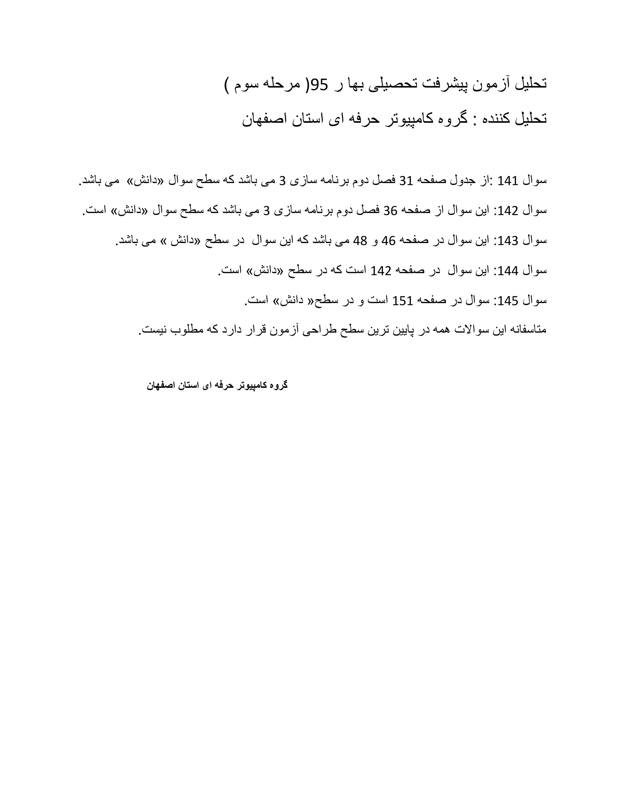 تحلیلر بها95)) سوم مرحله گروه : کننده تحلیلاصفهان استان ای حرفه کامپیوتر سوال141صفحه جدول :از31سازی برنامه دوم فصل3سوال سطح که باشد می«دانش».باشد می سوال142:صفحه از سوال این36سازی برنامه دوم فصل3سوال سطح که باشد می«دانش».است سوال143:صفحه در سوال این46و48این که باشد میسطح در سوال«دانش».باشد می سوال144صفحه در سوال این :142سطح در که است«دانش».است سوال145صفحه در سوال :151سطح در و است«دانش».است .نیست مطلوب که دارد قرار آزمون طراحی سطح ترین پایین در همه سواالت این متاسفانه اصفهان استان ای حرفه کامپیوتر گروه