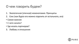 Документ обсуждает экологичную (этичную) немоногамию, включая принципы, такие как осознанность, честность и доверие. Он предлагает советы по поиску партнеров и управлению ревностью, а также подчеркивает важность работы над собой и отношениями. Кроме того, документ предоставляет ресурсы, включая книги и фильмы для дополнительного вдохновения.