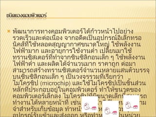 พัฒนาการทางคอมพิวเตอร์ได้ก้าวหน้าไปอย่างรวดเร็วและต่อเนื่อง จากอดีตเป็นอุปกรณ์อิเล็กทรอนิคส์ที่ใช้หลอดสุญญากาศขนาดใหญ่ ใช้พลังงานไฟฟ้ามากและอายุการใช้งานต่ำ เปลี่ยนมาใช้ทรานซิสเตอร์ที่ทำจากชินซิลิกอนเล็ก ๆ ใช้พลังงานไฟฟ้าต่ำ และผลิตได้จำนวนมาก ราคาถูก ต่อมาสามารถสร้างทรานซิสเตอร์จำนวนหลายแสนตัวบรรจุบนชิ้นซิลิกอนเล็ก ๆ เป็นวงจรรวมที่เรียกว่า ไมโครชิป (microchip) และใช้ไมโครชิปเป็นชิ้นส่วนหลักที่ประกอบอยู่ในคอมพิวเตอร์ ทำให้ขนาดของคอมพิวเตอร์เล็กลง ไมโครชิปที่มีขนาดเล็กนี้สามารถทำงานได้หลายหน้าที่ เช่น ทำหน้าที่เป็นหน่วยความจำสำหรับเก็บข้อมูล ทำหน้าที่เป็นหน่วยควบคุมอุปกรณ์รับเข้าและส่งออก หรือทำหน้าที่เป็นหน่วยประมวลผลกลาง ที่เรียกว่า ไมโครโพรเซสเซอร์ ซึ่ง ไมโครโพรเซสเซอร์ หมายถึงหน่วยงานหลักในการคิดคำนวณ การบวกลบคูณหาร การเปรียบเทียบ การดำเนินการทางตรรกะ ตลอดจนการสั่งการเคลื่อนข้อมูลจากที่หนึ่งไปยังอีกที่หนึ่ง หน่วยประมวลผลกลางนี้เรียกอีกอย่างว่า ซีพียู (Central Processing Unit : CPU) - 3.