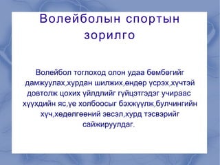 Волейболын спортын зорилгоВолейбол тоглоход олон удаа бөмбөгийг дамжуулах,хурдан шилжих,өндөр үсрэх,хүчтэй довтолж цохих үйлдлийг гүйцэтгэдэг учираас хүүхдийн яс,үе холбоосыг бэхжүүлж,булчингийн хүч,хөдөлгөөний эвсэл,хурд тэсвэрийг сайжируулдаг. - 3.