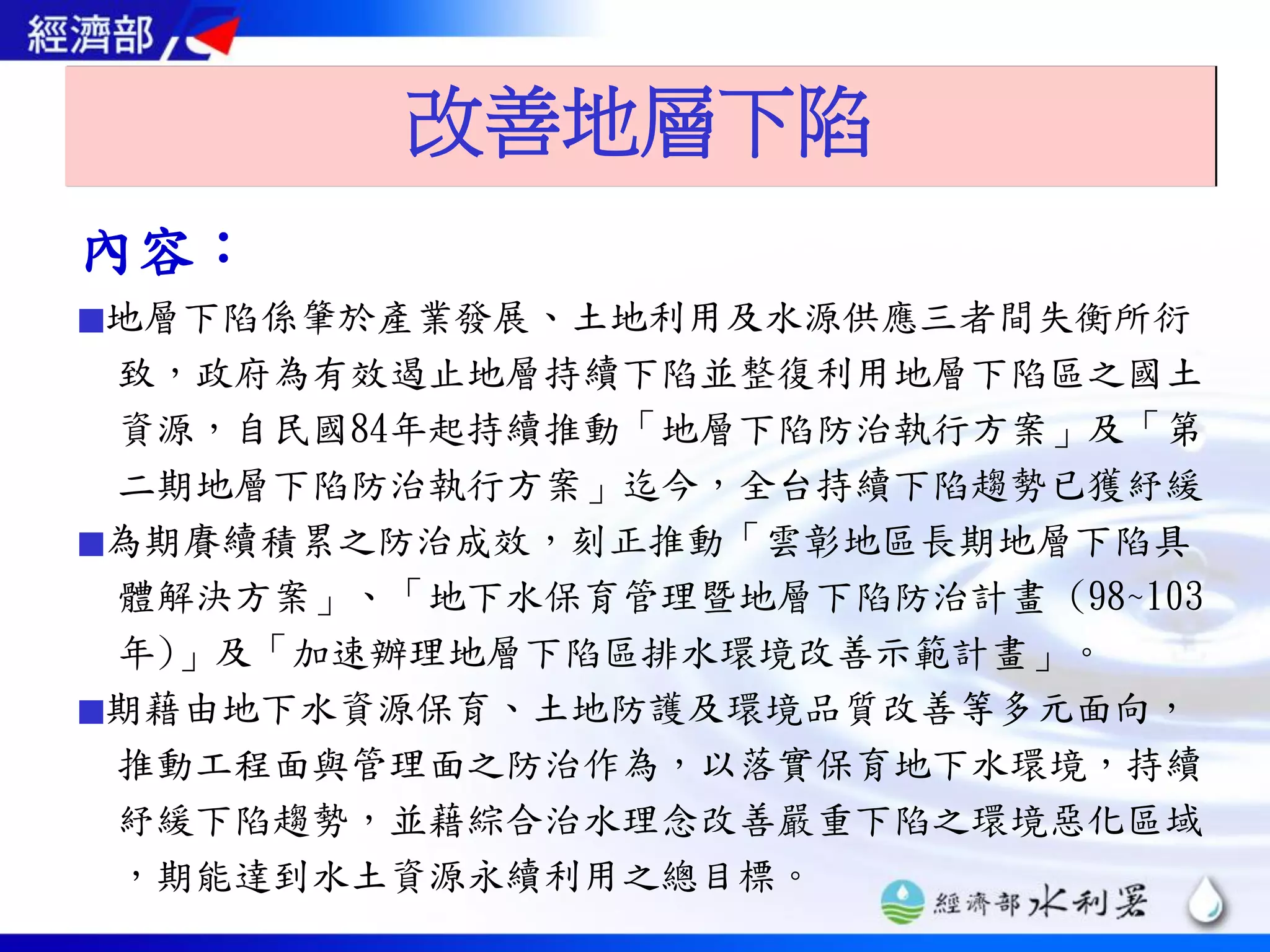 地層下陷是由于产业发展、土地利用和水源供应的不平衡而导致的,政府从民国84年开始推行防治方案,已有效缓解持续下陷的趋势。通过地下水资源保护、土地防护和环境改善等多方面措施,旨在实现水土资源的可持续利用。过去几年,地层下陷的面积和年下陷速率显著降低,同时多项地下水补注工程已完成,成效明显。