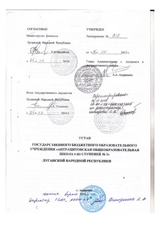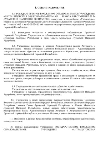 Документ описывает деятельность государственного бюджетного образовательного учреждения «Антрацитовская общеобразовательная школа І-ІІІ ступеней No 3» Луганской народной республики, созданного на основании распоряжения совета министров ЛНР. Основные задачи учреждения включают обеспечение всестороннего развития ребенка, реализацию образовательных программ, соблюдение государственных стандартов и формирование гражданской позиции у учащихся. Управление учреждением осуществляет администрация и директор, который ответственен за организацию учебно-воспитательного процесса и соблюдение законодательства.
