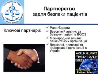 Партнерство задля безпеки пацієнтів Рада Європи Всесвітній альянс за безпеку пацієнтів ВООЗ Міжнародний альянс пацієнтських організацій Державні, приватні та недержавні організації в Україні Ключові партнери: