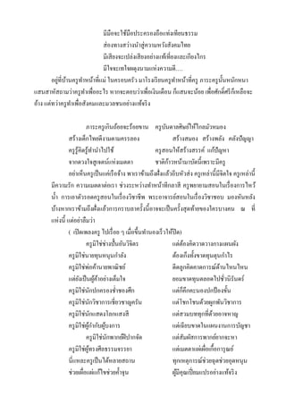 หรื อบางครั้งนาครู ไป นินทาลับหลัง ด่าครู ดวยวาจาที่หยาบคาย ครู ทนได้ถาศิษย์ของครู เป็ นคนดีเพราะการกระทาของ ้ ้ ครู แต่ขอให้พวกเธอพึงรู ้เถิดว่า ครู กเ็ ป็ นปุถุชน ครู กยงมีเลือดมีเนื้อ รู ้สึกเสี ยใจรู ้สึกดีใจ ็ั ตามวิสยของผูที่ยงเป็ นปุถุชนอยู่ บางครั้งครู รู้วาลูกศิษย์ของครู น้ นโกรธ เกลียด แอบนินทาครู ั ้ ั ่ ั ็ ้ ลับหลัง แต่ครู กตองทน เพราะครู เป็ นผูได้เสี ยสละ ได้มาทาหน้าที่เช่นนี้แล้ว ถ้าเธอจะถามว่า ้ แล้วครู ไม่มีทางอื่นที่จะหากินหรื อจึงต้องมาเป็ นครู พระอาจารย์ขอตอบแทนครู ของพวกเธอได้ ว่า ครู ของเธอทุกคนปรารถนาอาชีพอย่างอื่น ที่มีเงินเดือนมากกว่าความเป็ นครู ได้ แต่ ทาไมครู ไม่ทา เพราะในจิตวิญญาณของครู น้ น รักเด็กอยากจะช่วยกันสร้างเยาวชน ให้เป็ นคน ั ่ ที่มีคุณภาพอยูในสังคม ครู จึงต้องยอมเจ็บปวด ต่อการถูกนินทาว่ากล่าวจากลูกศิษย์ ที่ครู รัก และหวังดี เจ็บปวดที่เจ้าทา ครู ไม่จากลับแก้ไข ดื้อสุ ดกันตามวัย ครู อภัยเสมอมา เพราะเจ้าคือลูกศิษย์ ครู ไม่คิดจะหนีหน้า เจ้าซังครู นานา อยากพ้นหน้าให้เร็ววัน แต่บางครั้งเธอรู ้ไหมว่าครู ทอ ครู เหนื่อยและหมดกาลังใจ บางครั้งอยากจะไปทาอาชีพ ้ อย่างอื่น ที่ไม่ตองยุงเกี่ยวกับเด็ก ๆ ที่พดไม่ค่อยรู ้เรื่ อง แต่มาสานึกว่าตัวเองเป็ นครู มีหน้าที่ใน ้ ่ ู การแนะนาอบรม และก็พร่ าสอนศิษย์ให้เป็ นคนดี ครู นึกละอายใจ ที่ครู คิดที่จะเปลี่ยนอาชีพ จากความเป็ นครู พุทธบุตรทั้งหลาย ในความคิดของครู น้ นรักศิษย์ทุกคน แต่ศิษย์จะรู ้หรื อเปล่า ั ว่า ครู น้ นรักและเป็ นห่วงศิษย์ ครู คิดเมื่อเห็นศิษย์ทุกครั้งว่า ั ศิษย์รักคือความหวัง ดุจพลังอันโดดเด่น พร่ าสอนทุกเช้าเย็น ถึงเค็ญก็สู้ทน เพียงศิษย์เกิดปัญญา เพื่อวันหนั้าไม่หมองหม่น เหนื่อยนักหรื อขัดสน ครู เฝ้ าทนไม่ทอถอย ้ อยากเห็นเจ้าได้ดี มีศกดิ์ศรี มิต่าต้อย ั ชีวตครู ไม่เลิศลอย ิ หวังศิษย์นอยก้าวหน้าไป ้ แต่เมื่อไร มองเห็นศิษย์เรี ยงรายไร้เดียงสา อนิจจาเจ้าจะนึกรู ้สึกไหม เว้นพ่อแม่ผกพันธ์รักดังดวงใจ ู ่ จะมีใครรักเจ้าเท่าเทียมครู ถึงจะเหนื่อยแสนเหนื่อยเหลือจะอ้าง ใช่เหินห่างธรรมะหรอกนะหนู เห็นศิษย์นอยตาดาดาอยากค้ าชู ้ ถ่ายความรู ้มอบให้ศิษย์ไม่ปิดปัง