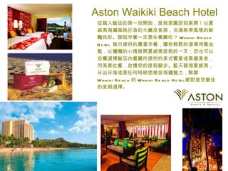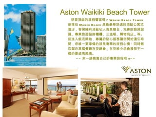 waikiki beach hotel 提供夏威夷海灘風格的住宿,客人可享用丰盛的自助早餐和多样美食,尽享悠闲假期。aston waikiki beach tower 是豪华公寓式酒店,设有私人海景阳台和完善的设施,提供顶级服务和便利的旅游咨询。酒店靠近高档餐饮和夜生活场所,适合追求奢华体验的游客。