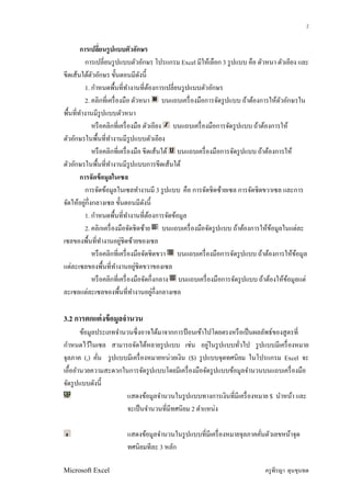 การเปลียนรู ปแบบตัวอักษร การเปลียนรู ปแบบตัวอักษร โปรแกรม Excel มีให้เลือก 3 รู ปแบบ คือ ตัวหนา ตัวเอียง และ ขีดเส้นใต้ตวอักษร ขันตอนมีดงนี ั ั 1. กําหนดพืนทีทํางานทีต้องการเปลียนรู ปแบบตัวอักษร 2. คลิกทีเครื องมือ ตัวหนา บนแถบเครื องมือการจัดรู ปแบบ ถ้าต้องการให้ตวอักษรใน ั พืนทีทํางานมีรูปแบบตัวหนา หรื อคลิกทีเครื องมือ ตัวเอียง บนแถบเครื องมือการจัดรู ปแบบ ถ้าต้องการให้ ตัวอักษรในพืนทีทํางานมีรูปแบบตัวเอียง หรื อคลิกทีเครื องมือ ขีดเส้นใต้ บนแถบเครื องมือการจัดรู ปแบบ ถ้าต้องการให้ ตัวอักษรในพืนทีทํางานมีรูปแบบการขีดเส้นใต้ การจัดข้ อมูลในเซล การจัดข้อมูลในเซลทํางานมี 3 รู ปแบบ คือ การจัดชิดซ้ายเซล การจัดชิดขวาเซล และการ จัดให้อยูกึงกลางเซล ขันตอนมีดงนี ่ ั 1. กําหนดพืนทีทํางานทีต้องการจัดข้อมูล 2. คลิกเครื องมือจัดชิ ดซ้าย บนแถบเครื องมือจัดรู ปแบบ ถ้าต้องการให้ขอมูลในแต่ละ ้ ่ เซลของพืนทีทํางานอยูชิดซ้ายของเซล หรื อคลิกทีเครื องมือจัดชิดขวา บนแถบเครื องมือการจัดรู ปแบบ ถ้าต้องการให้ขอมูล ้ ่ แต่ละเซลของพืนทีทํางานอยูชิดขวาของเซล หรื อคลิกทีเครื องมือจัดกึงกลาง บนแถบเครื องมือการจัดรู ปแบบ ถ้าต้องให้ขอมูลแต่ ้ ละเซลแต่ละเซลของพืนทีทํางานอยูกึงกลางเซล ่ 3.2 การตกแต่ งข้ อมูลจํานวน ข้อมูลประเภทจํานวนซึ งอาจได้มาจากการป้ อนเข้าไปโดยตรงหรื อเป็ นผลลัพธ์ของสู ตรที ่ กําหนดไว้ในเซล สามารถจัดได้หลายรู ปแบบ เช่น อยูในรู ปแบบทัวไป รู ปแบบมีเครื องหมาย จุลภาค (,) คัน รู ปแบบมีเครื องหมายหน่วยเงิน ($) รู ปแบบจุดทศนิยม ในโปรแกรม Excel จะ เอืออํานวยความสะดวกในการจัดรู ปแบบโดยมีเครื องมือจัดรู ปแบบข้อมูลจํานวนบนแถบเครื องมือ จัดรู ปแบบดังนี แสดงข้อมูลจํานวนในรู ปแบบทางการเงินทีมีเครื องหมาย $ นําหน้า และ จะเป็ นจํานวนทีมีทศนิยม 2 ตําแหน่ง แสดงข้อมูลจํานวนในรู ปแบบทีมีเครื องหมายจุลภาคคันตัวเลขหน้าจุด ทศนิยมทีละ 3 หลัก Microsoft Excel ครู พีรญา ดุนขุนทด